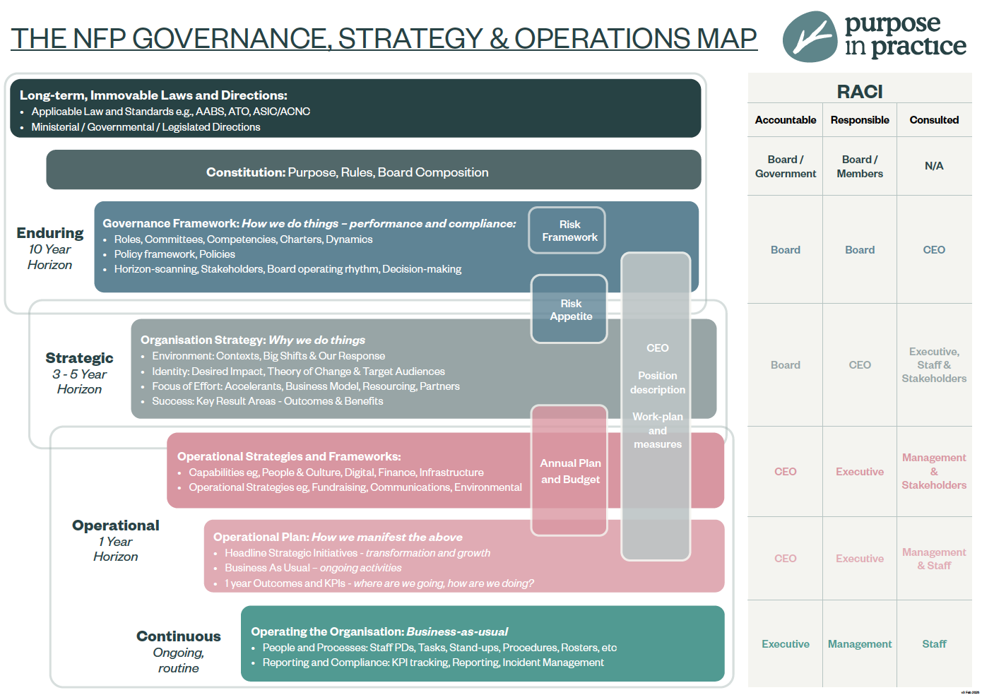 The map also relates these to accountability as a RACI showing who is accountable, responsible, consulted and informed at each level. This matters because confusion about ownership and responsibility is often a root cause of dysfunction.